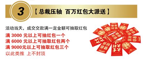 三、总裁压轴,百万红包大派送:活动当天,凡购买满一定的金额,最高1000元红包等您来抽。