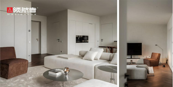 领航者定制柜是北欧色彩哲学的最佳载体,米白色的客厅定制柜用哑光质感避免强光刺眼,与墙面衔接自然,悄悄拉宽空间视觉;餐厨区的深棕色定制柜保留木纹底色,刚好呼应深色木地板,旁边再搭配浅灰色开放格架,深浅对比间带出细腻层次。就连角落的定制矮柜,也以“上浅下深”配色贴合整体风格,不破坏空间通透感,色彩和谐感全藏在这些定制柜的搭配里。