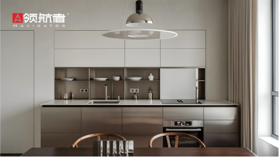 北欧风的“极简”藏在领航者厨房定制柜的功能里,厨房一体化柜体外侧平整,内里却藏“收纳魔法”——封闭柜可存放换季或不常用的厨房杂物,让空间远离杂乱;开放格用来放置常用餐具,拿取格外顺手;高柜的设计则方便取用深处物品,每一处空间都能被高效利用,真正做到功能“藏而不露”,令厨房既有着简约大气的视觉效果,又能充分满足实用的收纳与操作需求。