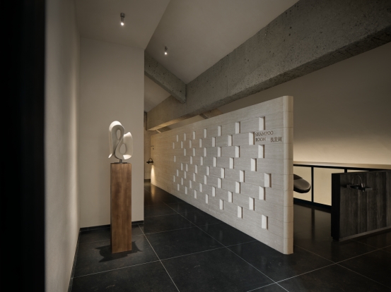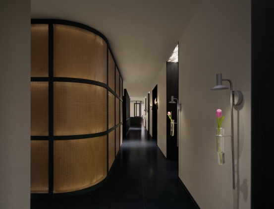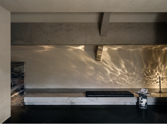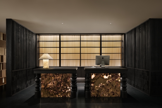 踏入室内,光线主导材质对话。透光玉石与原木岛台交织光影,奠定纯粹质感;白金沙石台阶与黑色木材在光线映衬下冷暖相映。无主灯设计以间接照明与氛围光源构建光系:陶砖电梯间内,壁龛烛火散发暖调微光;前台借背景与透光桌面,让光线在墙面静静流动。木阶与墙面的明暗对比自然划分等候、交流区,光线成为空间的隐形引导。