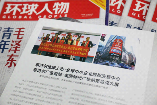 此外,版面内容还报道了泰诗尔成功挂牌全球股交、登陆美国纽约时代广场纳斯达克大屏等可喜可贺的消息。这一举一动都在预示着泰诗尔将成为墙面装饰行业标杆企业的重要助推力量,也象征着泰诗尔走向世界,面向全球展示中国品牌的魅力,面向全世界人民展现中国品牌力量。