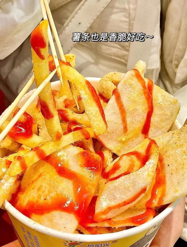 她将金华的红薯粉裹炸锁鲜的工艺与嵊州本地的年糕特色相融合,改良出了柳陈记独有的“黄金三剑客”——鸡柳、薯条、年糕三合一。